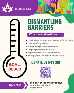 At the Canadian Unitarian Council, we’re committed to dismantling these barriers and created the Dismantling Barriers staff position as a response to the 8th principle. We offer leadership, resources, and support as we work to dismantle barriers together.
