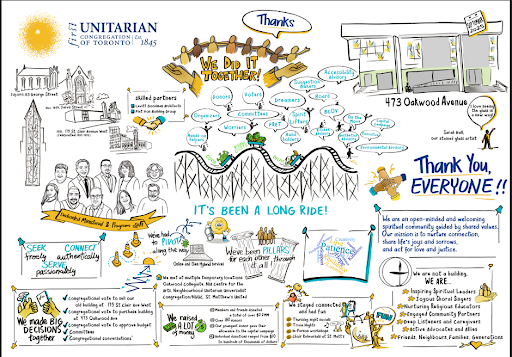 The original committee to consider moving from FirstU’s previous home (the 3rd since its founding in 1845) met 19 years ago.  Discernment proceeded slowly until 2017, when the congregation voted to sell 175 St. Clair Ave. W.  It took over a year to sell; 3 more (while still “leasing” at 175 St. Clair W.) to find a site meeting the requirements for accessibility, sustainability, financial viability, functionality, and location; and 4 more years to obtain permits and design and complete a massive renovation, funded by proceeds of the sale and a wildly successful members’ Capital Campaign – all against the backdrop of a pandemic, a series of temporary meeting locations, cost increases and delays, and the transition of two long-term ministers followed by two interim ministers.  Throughout this roller coaster ride, the FirstU community and staff drew upon deep resources of resilience, flexibility, patience, volunteerism, humour, and trust.